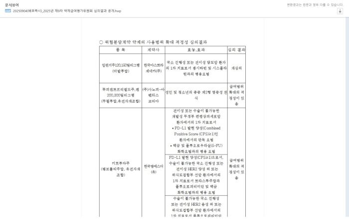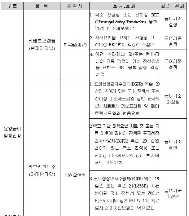 □ 건강보험심사평가원(원장 강중구)은 2025년 제7차 암질환심의위원회(9.3.)에서 심의한 ‘암환자에게 사용되는 약제에 대한 급여기준 심의결과’를 다음과 같이 공개한다.○ 신약(요양급여 결정신청) 및 …