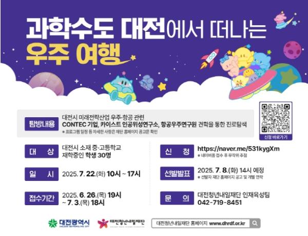 [헬스앤마켓리포터스, 조태익기자] 대전시는 지역 청소년들에게 미래 유망 산업인 항공우주 분야에 대한 진로 탐색 기회를 제공하기 위해 ‘국내 진로탐방’ 참여자를 6월 26일부터 7월 3일까지 모집한다.