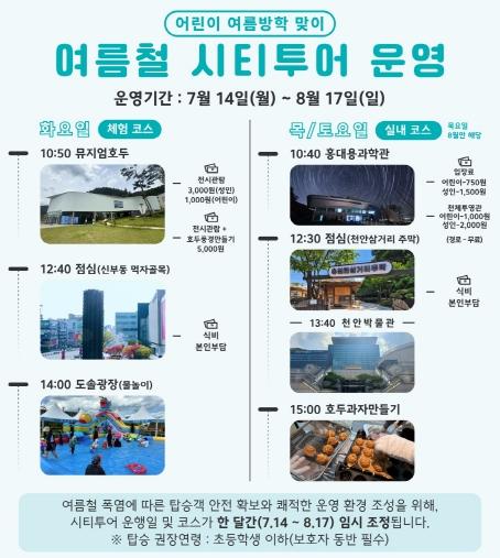 [헬스앤마켓리포터스, 조태익기자] 천안시는 여름철 무더위에 대비해 오는 7월 14일~ 8월 17일 혹서기 시티투어 코스를 운영한다고 4일 밝혔다.