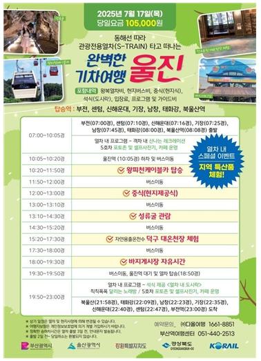특히, 17일 운행하는 울진 코스에서는 10만 5,000원의 가격으로 열차 내 모든 콘텐츠와 함께 왕피천케이블카, 성류굴, 덕구온천과 바지게시장 등 동해안 필수 여행지를 체험할 수 있다.