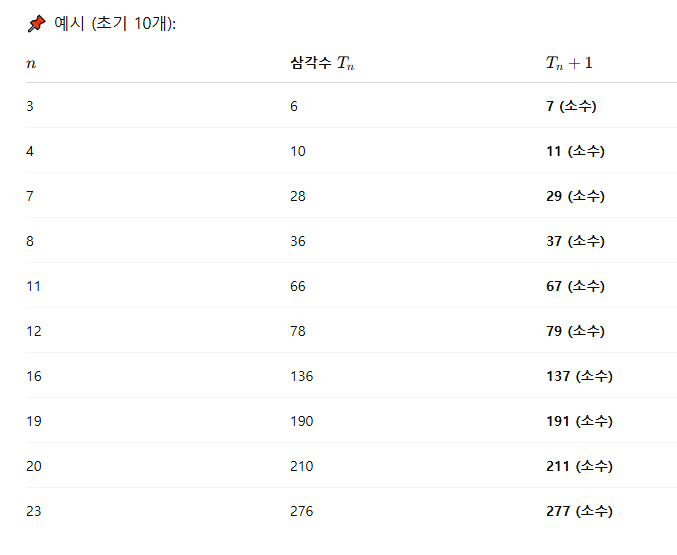 가령, 삼각수 6은 1을 더하면 7로 소수이고, 10은 1을 더하면 11로 소수이다. 28도 1을 더하면 29로 소수이고, 36도 1을 더하면 37로 소수이다.