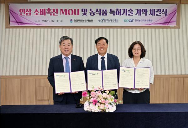 [헬스앤마켓리포터스, 강동진기자] 충북농업기술원은 11일 충북인삼농협(조합장 소진호), 정푸드코리아(회장 정보헌)와 충북 인삼 소비 확대를 위한 업무협약을 체결하고, 동시에 농식품 분야 특허기술 4건을 산업체에 이전했다고 밝혔다.