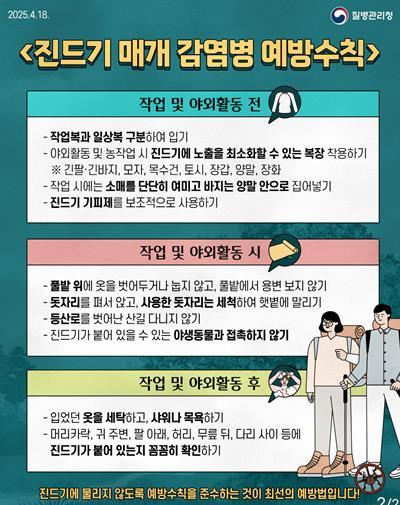 안병숙 보건소장은 "야외 활동이나 농작업 시 예방 수칙을 반드시 지켜야 한다″며 "야외 활동 후 2주 이내에 고열, 오한, 소화기 증상 등이 나타나면 즉시 의료기관을 방문해 진료받길 바란다″고 당부했다.