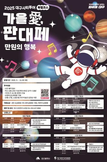 이번 특별노선은 지역의 예술·공연·축제를 하나로 묶은 ‘판대페’와 연계해, 대구의 대표 문화행사를 한눈에 둘러볼 수 있도록 알차게 구성됐다. 가을의 서정과 공연예술의 감동을 함께 즐기기에 안성맞춤이며, 시민과 관광객 모두에게 특별한 문화 체험 기회를 제공한다.