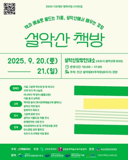 재단 관계자는 “설악산 책방은 속초의 자연과 문화, 독서가 결합한 새로운 형태의 문화예술교육 프로그램”이라며 “시민과 관광객이 함께 책과 문화를 즐기고 지역 독서문화가 한 단계 성장하는 계기가 되길 바란다”고 말했다.