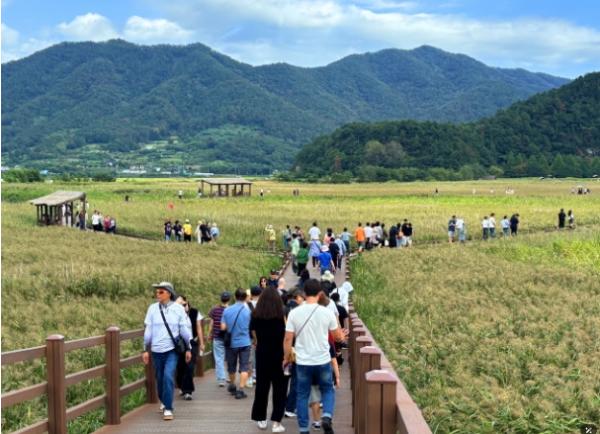 [헬스앤마켓리포터스, 조태익기자] 추석 연휴 순천만습지를 찾은 방문객들이 가을 정취 속에서 갈대밭 산책을 즐기고 있다.