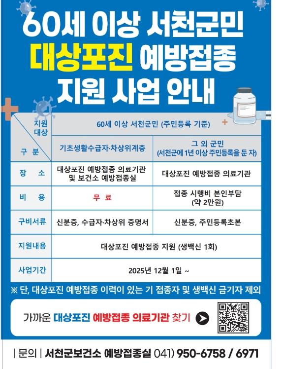 [헬스앤마켓리포터스, 조태익기자] 서천군은 고령층의 대상포진 발병과 합병증을 예방하고 건강한 노후를 지원하기 위해 오는 12월 1일부터 대상포진 예방접종 지원사업을 본격 추진한다.
