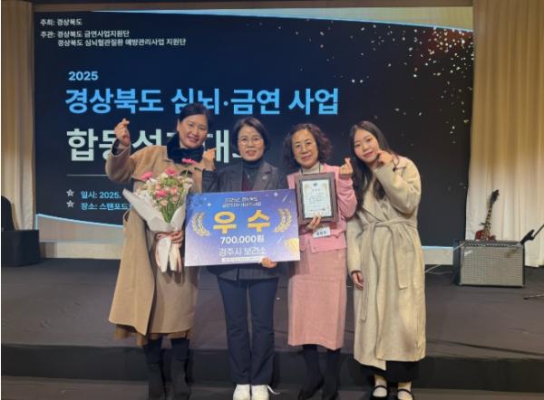 [헬스앤마켓리포터스, 조태익기자] 경주시보건소는 지난 5일 스탠포드호텔 안동에서 열린 ‘2025년 경상북도 심뇌혈관·금연사업 합동 성과대회’에서 금연지원서비스사업 부문 우수상을 수상했다고 밝혔다.