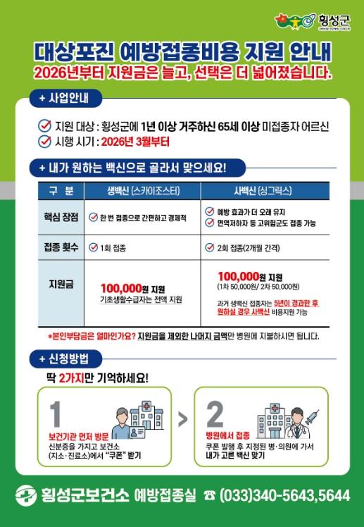 지원 대상은 횡성군에 1년 이상 주민등록을 둔 만 65세 이상 미접종자다. 올해부터는 개인의 건강 상태에 따라 생백신(1회 접종) 또는 사백신(2회 접종) 중 하나를 선택해 접종할 수 있다.