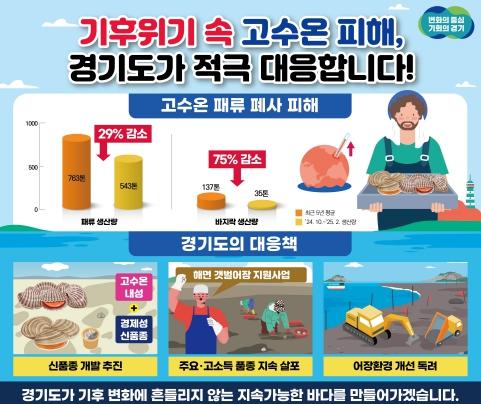 지난해 8월 16일부터 9월 25일까지 총 41일간 경기도 해역에 고수온 특보 발령 이후 10월부터 올해 2월까지 경기도 패류 생산량은 543톤으로, 최근 5년 평균(763톤) 대비 약 29% 감소했다. 특히, 주요 소득품종인 바지락 생산량은 35톤으로 5년 평균(137톤) 대비 약 75% 급감했다.