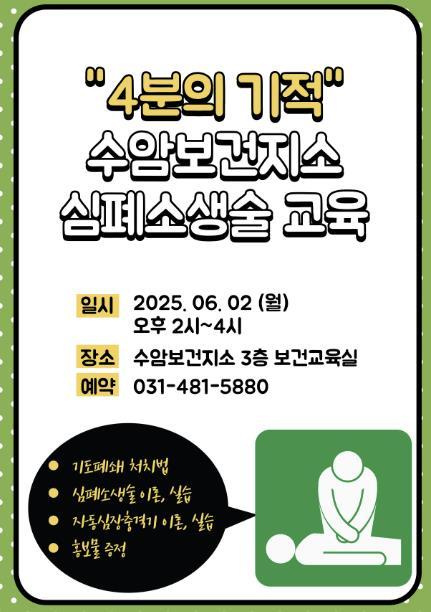 [헬스앤마켓리포터스, 조태익기자] 안산시 상록수보건소 수암보건지소는 다음달 2일 주민들의 응급상황 대처 능력 향상을 위한 ‘4분의 기적’ 상반기 심폐소생술 교육을 진행한다고 22일 밝혔다.