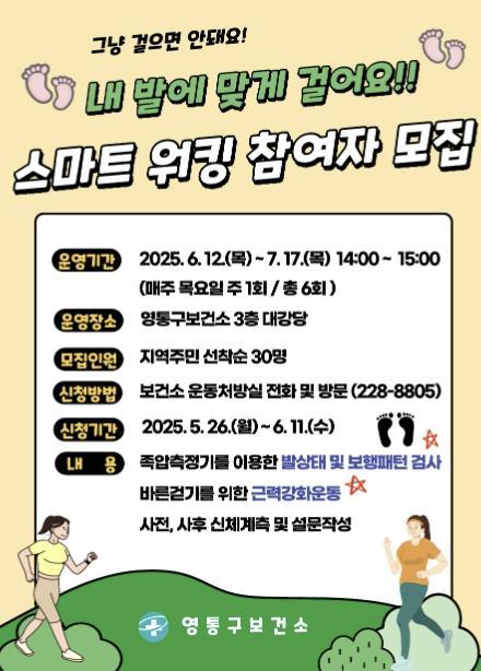 영통구보건소 관계자는 “단순히 걷기를 권장하는 것을 넘어, 개개인의 보행 상태를 파악하고 그에 맞는 맞춤형 근력운동을 제공하는 프로그램”이라며 “이번 프로그램에 참여해 내 발에 맞는 바르게 걷는 법을 알아보고 걷기를 생활화해 활기찬 일상을 누리길 바란다”고 말했다.