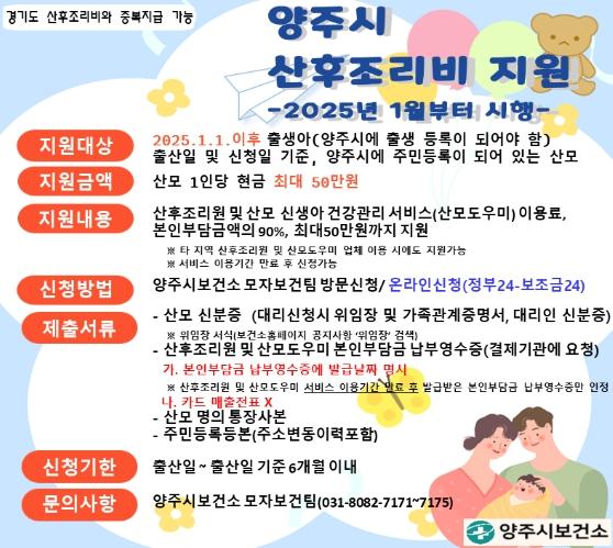 양주시 관계자는 “출산 후 회복은 곧 산모의 삶과 아기의 건강한 시작을 위한 가장 기본적인 배려이므로, 모든 가정이 경제적 부담없이 충분한 돌봄을 누릴 수 있도록 세심히 살피겠다”고 전했다.