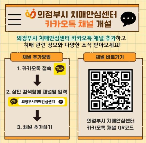채널은 카카오톡 앱 상단 검색창에 ‘의정부시 치매안심센터’를 입력하거나 홍보 포스터의 QR코드를 스캔해 추가할 수 있다.