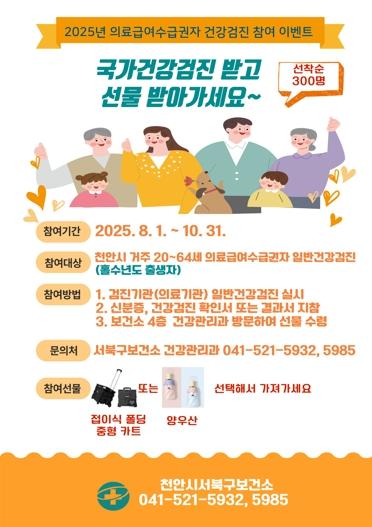 참여 대상은 천안시에 거주하는 1961~ 2005년생 의료급여수급권자 가운데 홀수년도 출생자로, 이벤트 기간 내 일반건강검진을 완료하면 소정의 선물을 받을 수 있다.