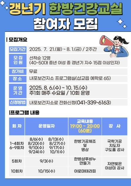 [헬스앤마켓리포터스, 조태익기자] 예산군 내포보건지소는 2025년 하반기 갱년기 한방건강교실 참여자 12명을 선착순 모집한다고 밝혔다.