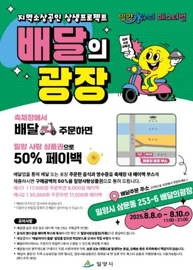 [헬스앤마켓리포터스, 조태익기자] 밀양시는 오는 8월 8일부터 10일까지 삼문동 밀양강변 둔치에서 개최되는 ‘2025 밀양 수퍼 페스티벌’ 기간 동안 지역 소상공인과의 상생을 위한 특별 행사‘배달의 광장’을 운영한다고 29일 밝혔다.