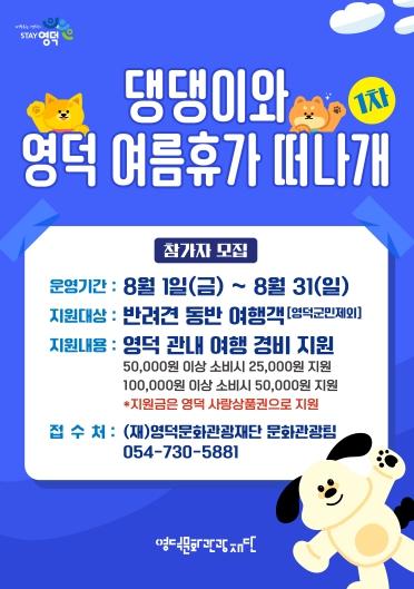 (재)영덕문화관광재단은 8월 한달 간, 지원금을 받으며 반려견과 함께 여행하는 프로그램 '댕댕이와 함께 영덕 여름휴가 떠나개'의 참가 신청을 받는다.