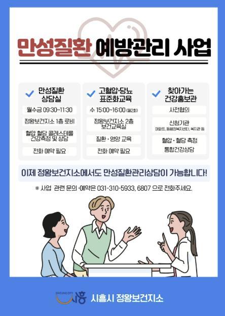 [헬스앤마켓리포터스, 조태익기자] 시흥시는 오는 8월 4일부터 매주 월, 수, 금 오전 중 정왕보건지소 1층에서 ‘만성질환 상담실’을 상시 운영한다.