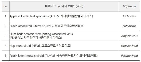 복숭아 나무가 바이러스에 감염되면 생육 불량과 기형과 발생으로 과실의 품질이 저하되어 극심한 피해를 유발한다. 이를 극복하려면 바이러스에 감염되지 않은 건전한 무병묘를 사용해야 하는데, 이때 감염여부를 신속하게 진단하는 기술이 반드시 필요하다.