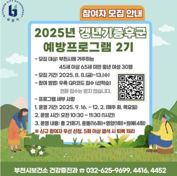 이번 제2기 프로그램은 9월 16일부터 12월 2일까지 매주 화·목요일 오전 10시 30분부터 11시 30분까지 진행되며, 총 12주간 21회에 걸쳐 운영된다. 대상은 부천시에 거주하는 45세 이상 65세 미만 여성이다.