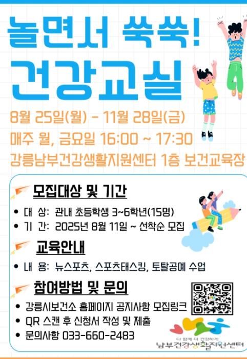 [헬스앤마켓리포터스, 조태익기자] 강릉시는 관내 초등학교 3~6학년을 대상으로 남부건강생활지원센터에서 진행되는 ‘놀면서 쑥쑥! 건강교실’ 참여 희망자 15명을 11일부터 선착순으로 모집한다.