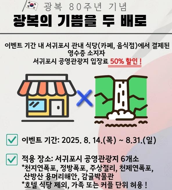 [헬스앤마켓리포터스, 조태익기자] 서귀포시는 광복 80주년을 기념하여 8월 14일부터 31일까지 서귀포시 소재 음식점 영수증을 지참한 방문객에게 입장료 50%를 할인하는 특별 할인 행사를 진행한다.