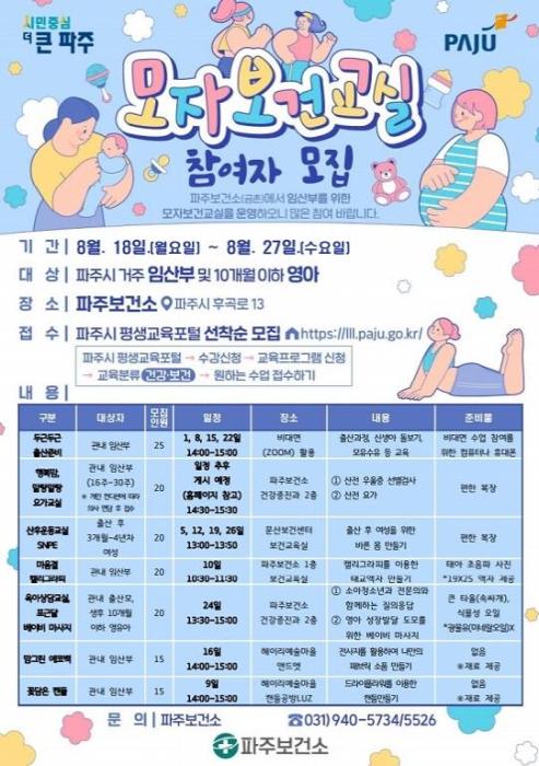 파주보건소 관계자는 “모자보건교실은 임신·출산·육아에 꼭 필요한 정보와 경험을 제공하는 중요한 프로그램으로, 시민들의 많은 참여를 바란다”라고 말했다.