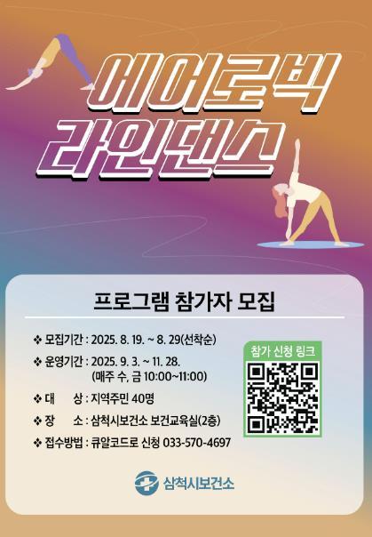[헬스앤마켓리포터스, 조태익기자] 삼척시보건소가 9월 3일부터 11월 26일까지 지역 어르신을 대상으로 에어로빅·라인댄스 교실을 운영한다.