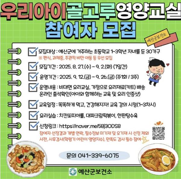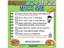 [헬스앤마켓리포터스, 조태익기자] 예산군보건소는 성장기 아동의 올바른 식습관 형성을 돕기 위해 오는 9월 3주간 ‘우리아이 골고루 영양교실’을 운영한다.