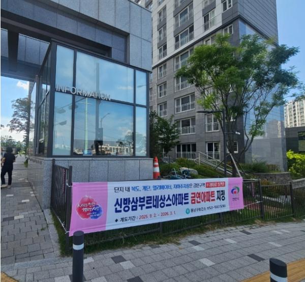 이번에 금연아파트로 지정된 신방삼부르네상스 아파트에는 현판과 현수막, 금연구역 안내표지가 지원된다.