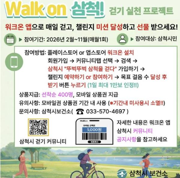 [헬스앤마켓리포터스, 조태익기자] 삼척시는 시민들의 건강 증진과 일상 속 걷기 실천율 향상을 위해 모바일 걷기 앱 '워크온(Walk On)'을 활용한 ‘워크온 걷기 챌린지’를 오는 2월부터 11월까지 운영한다.