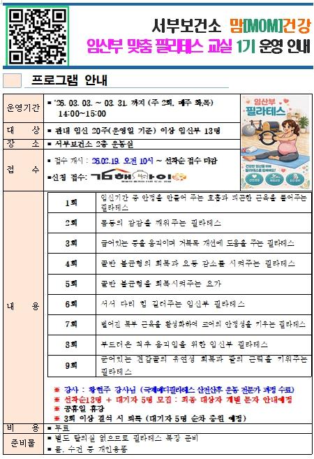 [헬스앤마켓리포터스, 조태익기자] 김해서부보건소는 임신부의 신체 건강 증진과 건강한 출산을 지원하기 위해 2026년부터 처음으로'맘(MOM)건강 임신부 맞춤 필라테스 교실'을 운영 한다.
