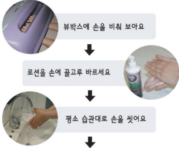 손세정 교육기인 ‘뷰박스’는 형광 로션을 오염물질로 가정해 손에 바른 뒤 특수 조명 아래에서 세정 상태를 확인하는 장비다. 손 씻기 전에는 형광 물질이 선명히 드러나고, 올바른 방법으로 30초 이상 비누를 사용해 손가락 사이와 손톱 밑까지 씻은 후에는 잔여 오염 부위를 확인할 수 있다. 이를 통해 스스로 부족한 부분을 인지하고 개선하도록 유도한다.