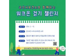 군산시보건소가 모바일 걷기 앱 ‘워크온(WalkOn)’을 활용한 월별 걷기 챌린지를 2월부터 12월까지 운영할 예정이라고 밝혔다.이번 챌린지는 시민의 일상 속 걷기 실천을 유도하고 시민 건강증진을 위해 마