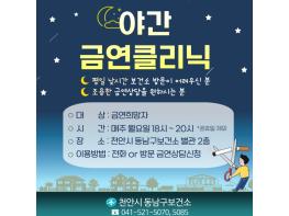 천안시 동남구보건소는 새해를 맞아 오는 11월까지 야간 금연클리닉을 운영한다고 8일 밝혔다. 야간 금연클리닉은 시간적 제약으로 금연클리닉 이용이 어려운 직장인 등을 위해 마련됐으며, 매주 월요일에