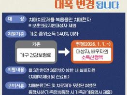 당진시보건소 치매안심센터는 2026년 1월 1일부터 치매치료관리비 지원사업의 소득 기준 산정 방법이 변경된다고 31일 밝혔다.이번 제도 개선으로 치매치료관리비 소득 산정이 가구 단위 건강보험료 기준에