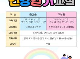 금산군보건소는 군민의 건강증진과 생활 속 신체활동 실천을 위해 오는 12월까지 금산읍·추부면에서 건강 걷기 교실을 운영한다.금산읍 교육은 지난 16일 시작됐고 추부면은 오는 24일 시작한다.이 프로그램