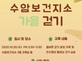 안산시 상록수보건소 수암보건지소는 지역 주민의 건강증진을 도모하기 위해 ‘수암 가을 걷기 교실’ 참가자를 모집한다고 14일 밝혔다.이번 걷기 교실은 올바른 걷기 방법을 배우고 실습해 봄으로써 일상