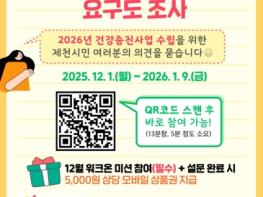 제천시보건소는 12월 1일부터 2026년 1월 9일까지 ‘2026년 통합건강증진사업 주민 요구도 조사’를 실시한다고 밝혔다.이번 조사는 제천 시민의 주요 건강 문제와 보건 서비스 요구를 종합적으로 파악하여