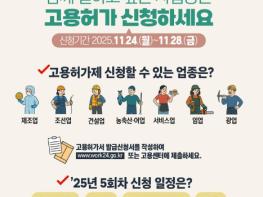 외국인근로자(E-9)와 함께 일하고 싶은 사업장은 고용허가 신청하세요.- 신청기간 2025.11.24.(월)~11.28.(금)■ 고용허가제 신청할 수 있는 업종은?제조업, 조선업, 건설업, 농축산·어업, 서비스업, 임업,