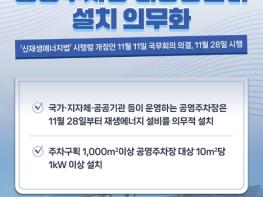 ■ 공영주차장 태양광설비 설치 의무화'신재생에너지법' 시행령 개정안 11월 11일 국무회의 의결, 11월 28일 시행- 국가·지자체·공공기관 등이 운영하는 공영주차장은 11월 28일부터 재생에너지 설비를 의무