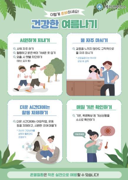 [헬스앤마켓리포터스, 조태익기자] 예산군보건소는 본격적인 여름철 폭염에 대비해 건강 취약계층을 대상으로 방문건강관리와 경로당 순회 교육을 강화하며 군민들의 건강한 여름나기를 지원하고 있다고 7일 밝혔다.