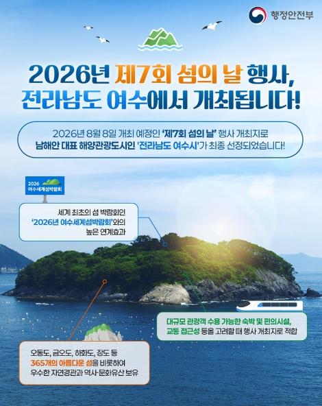 [헬스앤마켓리포터스, 조태익기자] 2026년 8월 8일 개최 예정인 '제7회 섬의 날' 행사 개최지로 남해안 대표 해양관광도시인 '전라남도 여수시'가 최종 선정되었습니다!