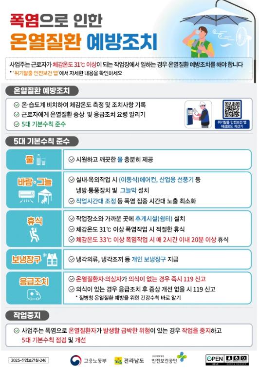 전남도는 폭염 속 온열질환을 예방하기 위해 ▲물 자주 마시기(갈증 느끼지 않도록 정기적 섭취) ▲한낮 야외 활동 자제(오후 2시~5시 피하기) ▲시원한 옷차림과 휴식(매 2시간 작업 후 20분 이상 휴식) ▲어지러움, 근육경련 시 즉시 중단하고 119 신고 등 도민과 작업자에게 예방 수칙 준수를 당부했다.