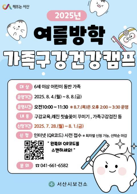 [헬스앤마켓리포터스, 조태익기자] 충남 서산시는 여름방학을 맞아 ‘가족 구강건강 캠프’를 오는 8월 4일부터 8일까지 5일간 운영한다고 밝혔다.