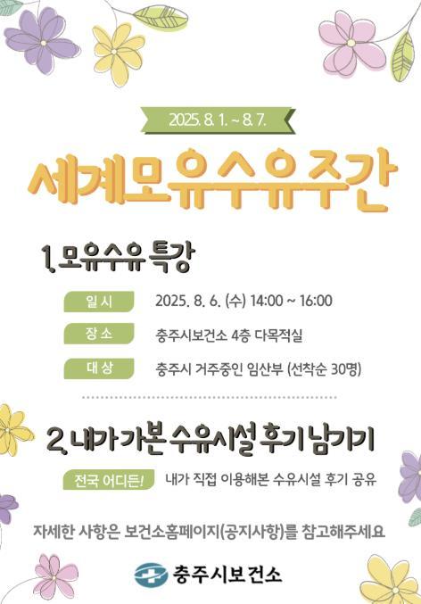 [헬스앤마켓리포터스, 조태익기자] 충주시보건소는 세계모유수유 주간을 기념해 ‘모유수유 특강’과 ‘내가 가본 수유 시설 소개하기’ 행사를 진행한다고 23일 밝혔다.