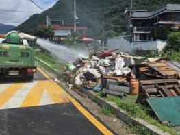 방역팀은 인력이 접근하기 어려운 산사태 지역까지 방역특장차를 동원해 소독 작업을 했다. 또 방역약품을 활용해 감염 매개체 서식처를 집중 방역소독했다.
