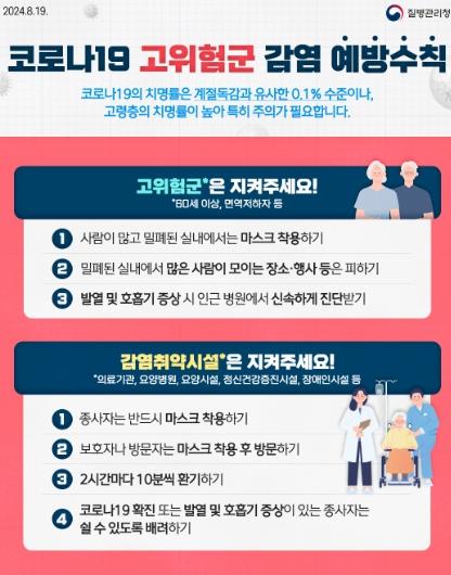 특히 고령층, 면역저하자 등 코로나19 고위험군과 요양병원·요양시설 등 감염취약시설 종사자 및 방문자는 밀집 환경에서 마스크를 착용하고 발열이나 호흡기 증상 시 신속히 진료를 받아야 한다.