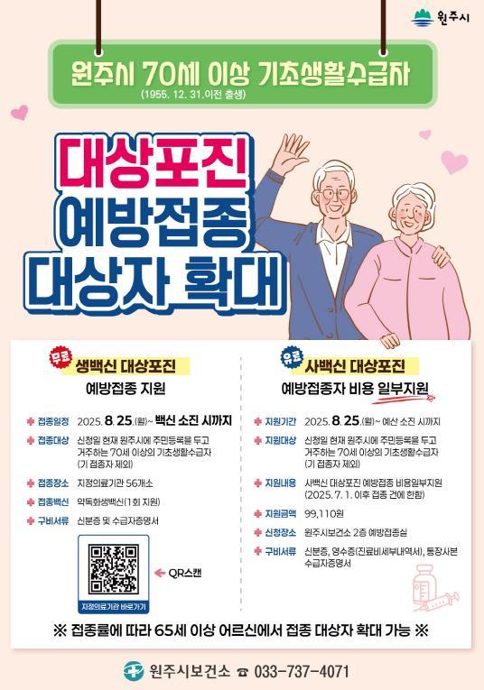 지원 대상은 신청일 기준 원주시에 주소를 둔 70세 이상(1955년 12월 31일 이전 출생자) 기초생활수급자다. 지원 백신은 대상포진 생백신이며, 대상포진 접종 이력이 있는 경우 접종이 불가능하다.